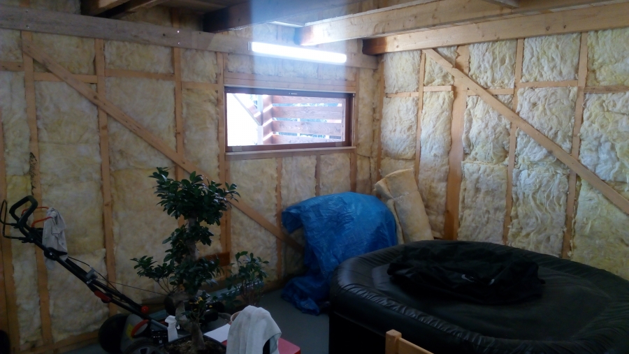 Uvnitř podlaha z osb,stěny zatepleny vatou 14cm a záklop osb.