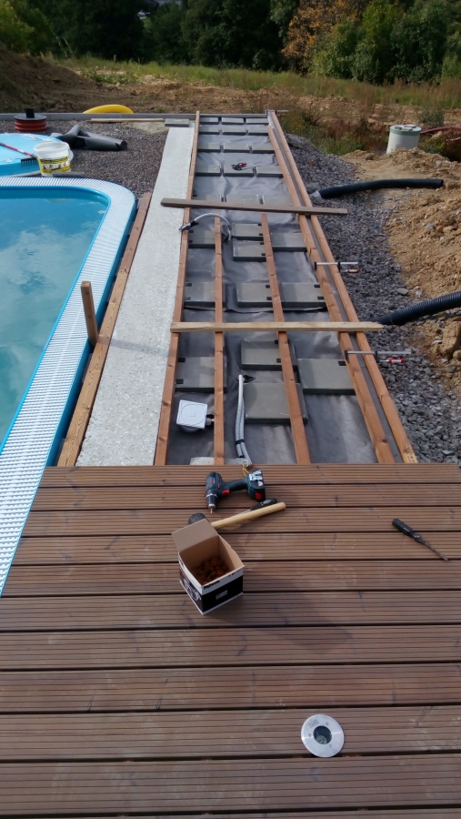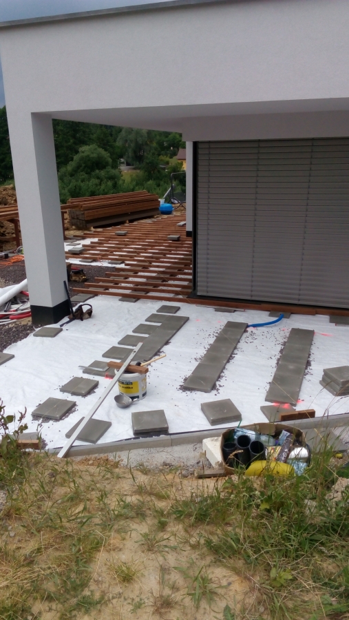 Podklad kamenivo,zhutněno,geotextilie a kachle.